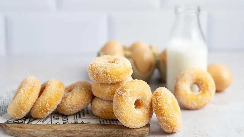 Queste ciambelle fritte sono un classico della pasticceria casalinga, che conquista per la loro soffice consistenza interna e la doratura croccante. La doppia lievitazione garantisce un impasto arioso e leggero, mentre la frittura in olio abbondante crea una superficie irresistibilmente dorata e leggermente zuccherata.