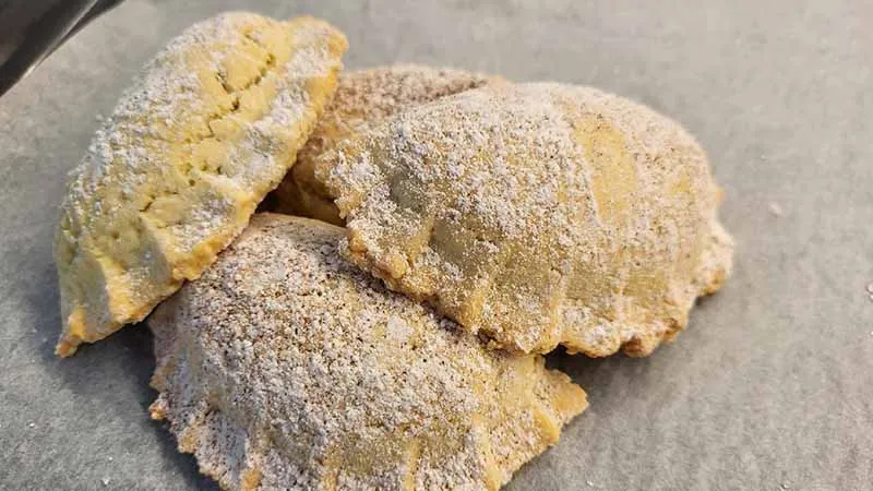 Perfetti per concludere un pranzo informale con un tocco di classe o per impreziosire una merenda d'eccezione, questi ravioli conquistano per la loro praticità: preparati in anticipo, attendono solo il calore del forno per trasformarsi in piccoli capolavori monoporzione, la cui polvere di zucchero a velo finale ricorda una leggera brina mattutina su una mezzaluna dorata.