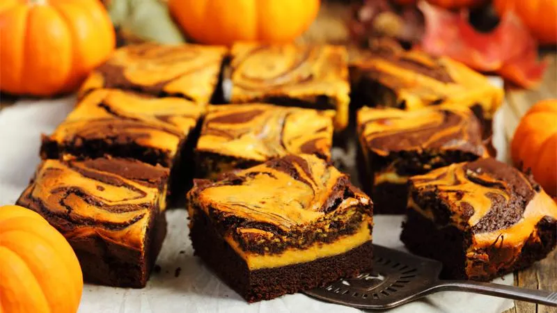 Un brownie che unisce l'intensità del cioccolato fondente alla dolcezza terrosa della zucca, creando un dessert dal cuore morbido e dalla superficie leggermente croccante. La marmorizzazione dei due impasti regala non solo un effetto visivo affascinante, ma anche un equilibrio di sapori dove le note speziate della cannella si fondono con la profondità del cacao.