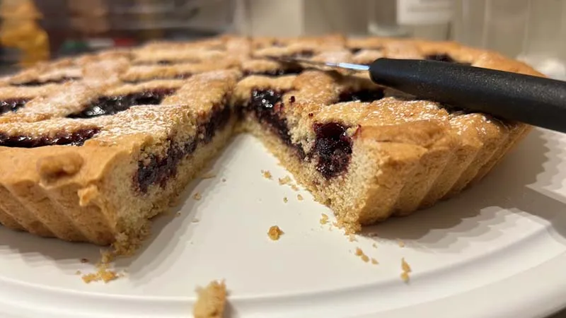 La crostata alla marmellata di amarene è un dolce rustico e genuino, che conquista con il suo equilibrio tra la pasta frolla friabile e leggermente granulosa e il cuore di confettura intensa e leggermente acidula. Il contrasto tra la dolcezza delicata dell'impasto, arricchito dalla scorza di limone, e la nota vivace delle amarene crea un'esperienza gustativa piacevolmente complessa.