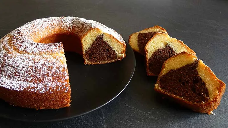 Questa ciambella marmorizzata è un dolce soffice e umido, dove l'effetto visivo del marmo si accompagna a un gusto delicato e bilanciato. La presenza dello yogurt conferisce una consistenza particolarmente tenera e una piacevole freschezza, rendendola perfetta per ogni momento della giornata. Il contrasto tra l'impasto chiaro, aromatizzato alla pesca, e quello scuro al cacao amaro crea un'esperienza gustativa elegante.