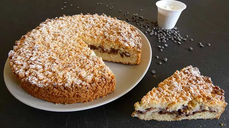 La ricotta, lavorata a freddo, mantiene una consistenza vellutata e leggera, mentre le gocce di cioccolato fondente si sciolgono appena in bocca creando piccoli momenti di intensità. La doppia texture è la vera firma di questa preparazione: lo strato inferiore compatto sostiene la farcitura, mentre la copertura sbriciolata si dorisce in forno diventando croccante in superficie e tenera all'interno.