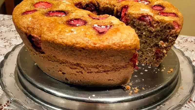 Le fragole, leggermente macerate nel limone, rilasciano un succo aromatico che si caramella leggermente in superficie durante la cottura, creando un contrasto tra la crosta dorata e l'interno umido. Ideale per una colazione nutriente o una merenda pomeridiana, questa torta si prepara in modo semplice e si conserva bene per alcuni giorni, diventando ancora più saporita il giorno dopo.