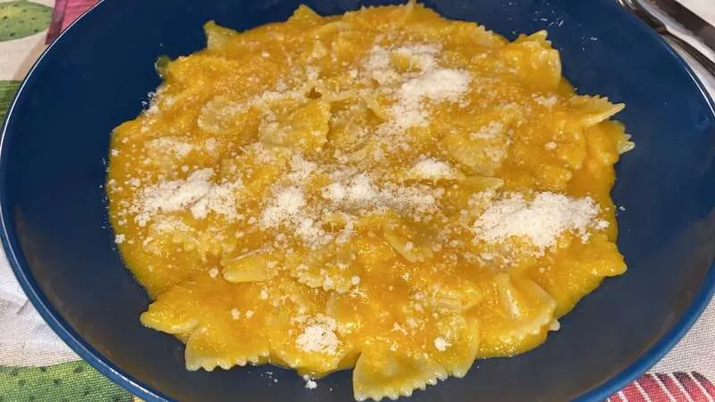 Un primo piatto autunnale che unisce la dolcezza cremosa della zucca alla pasta, per un risultato confortante e ricco di sapore. La zucca, cotta fino a diventare una salsa vellutata, avvolge perfettamente le farfalle, creando un piatto dal gusto rotondo e leggermente dolce, bilanciato dalla sapidità del parmigiano.