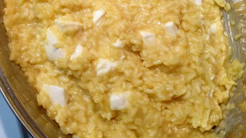 Il risotto alla milanese con mozzarella è un primo piatto che unisce la tradizionale cremosità del risotto allo zafferano alla sorpresa filante e fresca della mozzarella. Il contrasto tra il colore dorato intenso e la consistenza vellutata del riso, arricchita dallo sciogliersi del formaggio, crea un'esperienza gustativa ricca e appagante.