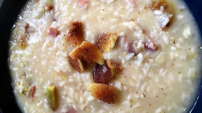 Un risotto che unisce la dolcezza vellutata dei fichi maturi alla sapidità intensa dello speck e alla cremosità piccante del gorgonzola. Il risultato è un piatto ricco di contrasti, dove la morbidezza del riso carnaroli si fonde con i cubetti croccanti di speck e i quarti di frutta che si sfaldano delicatamente.