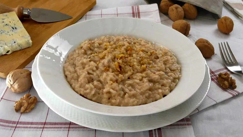 La dolcezza della cipolla stufata nel burro prepara la base per il riso, che viene poi sfumato con vino bianco per aggiungere una nota fresca e acida. L'aggiunta finale del gorgonzola, che si scioglie in una crema vellutata, e del parmigiano grattugiato, crea una mantecatura liscia e corposa, mentre le noci tritate e quelle intere per la decorazione offrono piacevoli scoppi di croccantezza.