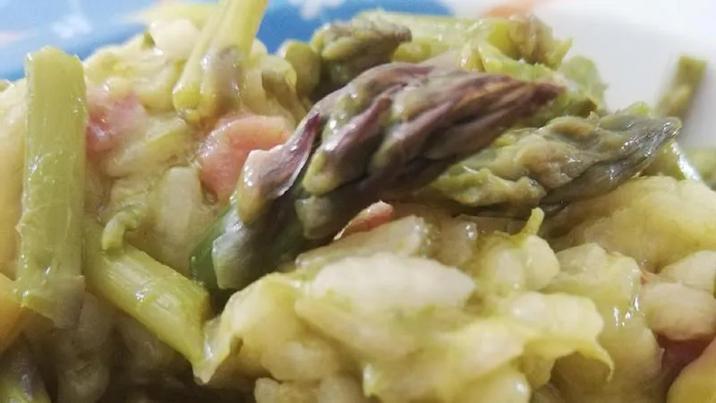 con i chicchi di riso carnaroli che rilasciano il loro amido per una mantecatura vellutata, mentre i gambi di asparago rimangono leggermente croccanti per un piacevole contrasto.