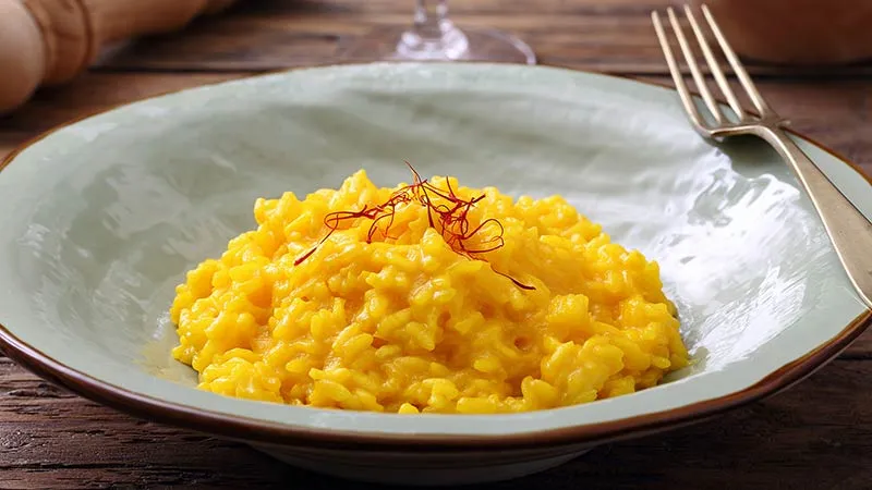 Il risotto allo zafferano è un classico della cucina lombardia che incanta con il suo colore dorato intenso e la sua cremosità avvolgente. Ogni chicco di riso, cotto al punto giusto, si fonde in una mantecatura ricca e setosa che rilascia il caratteristico profumo speziato dello zafferano, bilanciato dalla sapidità del brodo e dalla dolcezza dello scalogno. La qualità dello zafferano, sciolto in acqua tiepida per sprigionare tutto il suo aroma, e il brodo di carne, che dona profondità di sapore, sono gli elementi chiave di questo piatto.