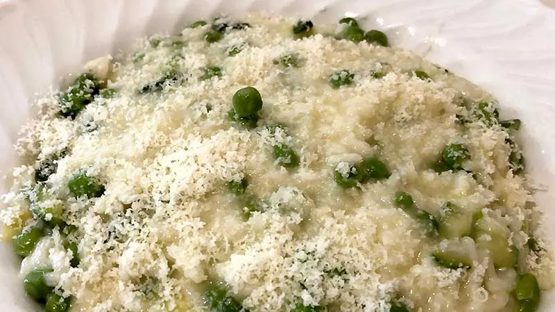 Un risotto dalla cremosità avvolgente e dal sapore delicatamente primaverile, dove la dolcezza dei piselli si fonde con la freschezza delle zucchine in un equilibrio perfetto. La consistenza è liscia e setosa, grazie alla lenta cottura che rilascia l'amido del riso, mentre un tocco di peperoncino in polvere aggiunge una lieve nota vibrante che riscalda il palato senza coprire i sapori principali.