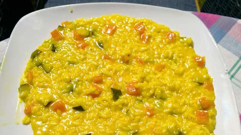 vellutata del riso, ottenuta grazie alla lenta cottura, si sposa perfettamente con i dadini di verdura che mantengono una piacevole tenerezza. Il cipollotto, appassito nell'olio, dona una base aromatica sottile, mentre lo zafferano infonde un colore dorato e un profumo inconfondibile.