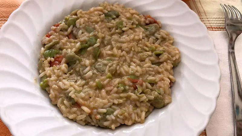 all'onda, con i chicchi di riso carnaroli che rilasciano il giusto amido, mentre le fave restano tenere ma non sfatte, offrendo un piacevole contrasto.