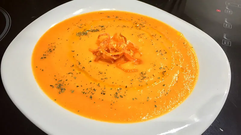 Una vellutata che trasforma l'umile carota in un'esperienza di comfort food raffinato. La sua consistenza setosa avvolge il palato, mentre il profumo agrumato dell'arancia aggiunge una nota di freschezza inaspettata che alleggerisce la dolcezza naturale della radice. Il contrasto tra la cremosità della panna e la punta di pepe crea un equilibrio perfetto, rendendo ogni cucchiaiata piacevolmente complessa.