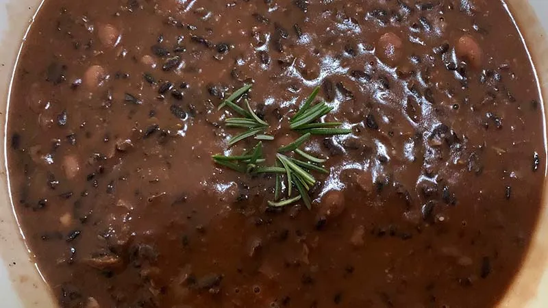 La minestra di riso nero e fagioli è un'ode alla profondità rustica, dove l'eleganza terrosa del riso Venere dialoga con la generosità cremosa dei borlotti in un abbraccio che promette non solo sostanza, ma una complessità di sapori stratificati. È un piatto che seduce con la sua franchezza contadina, elevata da un equilibrio sapiente tra robustezza e delicatezza.