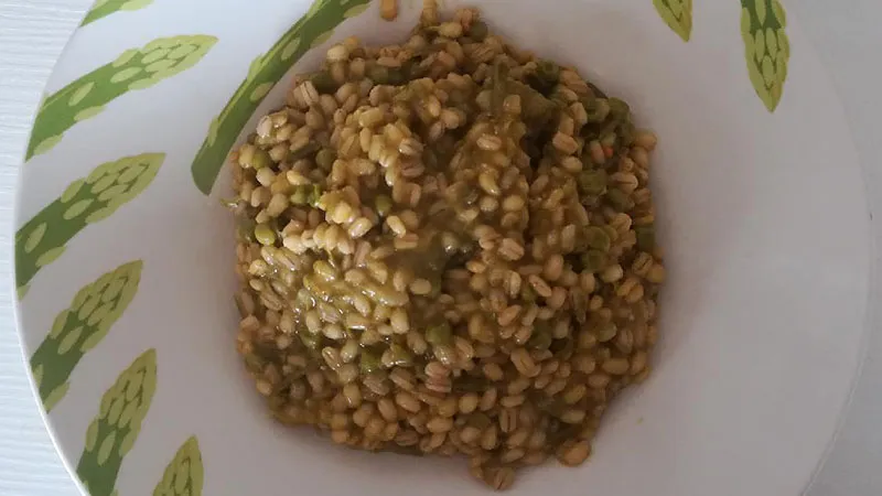 avvolgente, dove lo zafferano aggiunge un tocco aromatico e una calda tonalità dorata, perfetta per una cena elegante ma informale. La freschezza croccante delle punte di asparagi contrasta piacevolmente con la morbidezza dell'orzo ben cotto, mentre i piselli regalano note dolci che bilanciano il leggero amaro del vegetale.