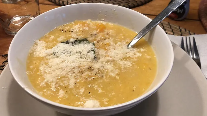 ingredienti in una crema vellutata, dove il fondo vegetale dona profondità senza coprire i sapori primari. Il contrasto tra la morbidezza della zucca e la tenerezza dei ceci è armonizzato dall'olio extravergine a crudo, che aggiunge un tocco fruttato e pepato.