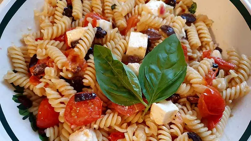 della feta. La pasta si avvolge in un sughetto leggero ma ricco di sapore, dove l'agrodolce del pomodoro incontra il contrasto salino del formaggio greco.