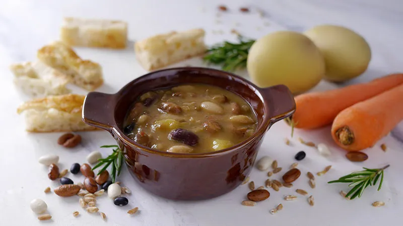 Questa zuppa è un abbraccio caldo e corroborante, perfetta per le serate invernali. La consistenza è ricca e cremosa, con i chicchi di farro perlato che regalano una piacevole resistenza al dente, mentre i fagioli borlotti e le patate si sfaldano dolcemente, addensando il brodo. Il profumo è quello autentico e rustico della cipolla e della carota stufate nell'olio extravergine, che forma la base aromatica di ogni cucchiaiata.