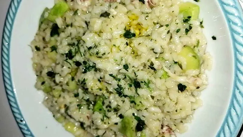 Un risotto dal sapore marino e delicatamente primaverile, dove la cremosità del riso carnaroli incontra la tenerezza dei calamari e la freschezza delle zucchine. La cottura lenta e costante permette al riso di rilasciare il suo amido, creando una consistenza vellutata e avvolgente, mentre il vino bianco aggiunge una nota aromatica e leggermente acidula che bilancia la dolcezza dei molluschi.