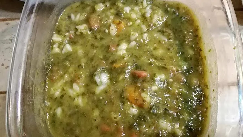 La carota e la cipolla, appassite nell'olio, rilasciano una base aromatica profonda, mentre le patate e la verza si sfaldano lentamente, addensando il brodo in modo naturale. I fagioli borlotti, già cotti, mantengono una piacevole tenerezza e si sposano con il riso che cuoce direttamente nel brodo, assorbendone tutto il sapore.