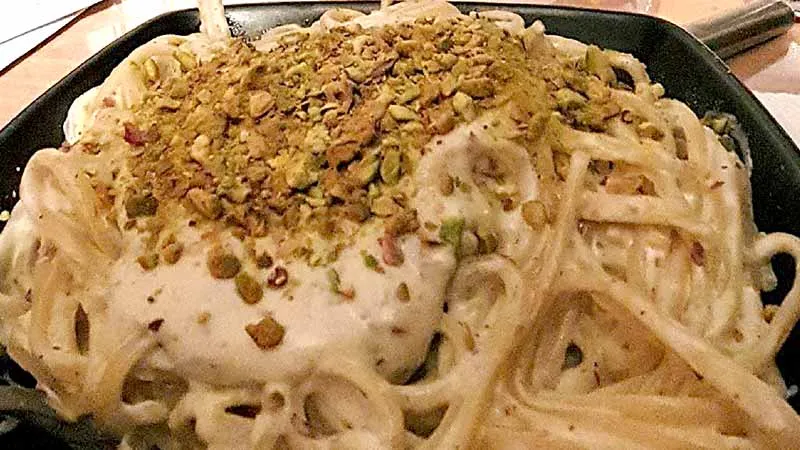 La crema, ottenuta dall'unione di pistacchi tostati, panna e mascarpone, sviluppa una profondità aromatica notevole, bilanciata dalla sapidità del parmigiano e da una punta di pepe nero. Gli spaghetti, cotti al dente, raccolgono magistralmente la salsa, creando un insieme armonioso dove il dolce del pistacchio dialoga con la nota salata.