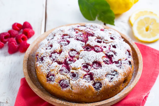 Una torta morbidissima e delicata, dove l'acidità vivace dei lamponi si fonde con la dolcezza dell'impasto vegano, creando un equilibrio perfetto per il palato. La scorza di limone aggiunge una nota fresca e aromatica che esalta la frutta.