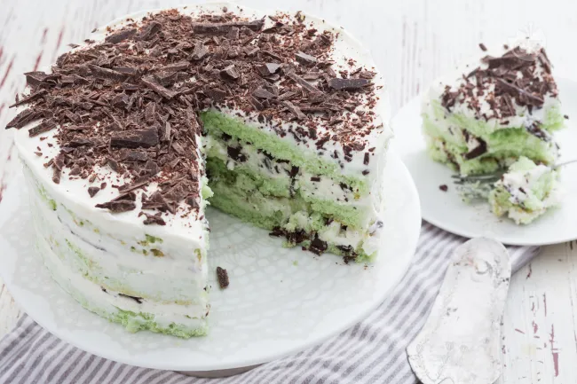 La menta, presente nello sciroppo che aromatizza l'impasto, dona una nota fresca e persistente senza essere invasiva, bilanciata dalla dolcezza della crema al mascarpone e vaniglia. La glassatura leggera sui bordi e la superficie guarnita con scaglie di cioccolato completano il dolce con un tocco di croccantezza.