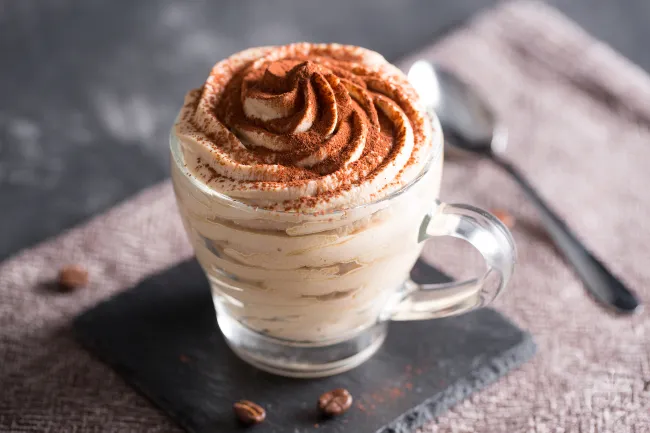 La preparazione si basa su due elementi chiave: una meringa italiana al caffè, che dona struttura e lucentezza, e una crema a base di mascarpone e panna, arricchita con caffè solubile per un gusto deciso. La gelatina assicura una consistenza stabile e setosa, senza appesantire il dessert.