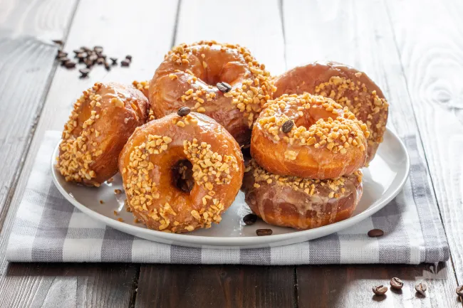 Queste ciambelle fritte offrono un'esperienza di pasticceria casalinga irresistibile, con una morbidezza soffice all'interno e una doratura perfetta all'esterno. La glassa al caffè aggiunge una nota aromatica intensa che si sposa magistralmente con la croccantezza della granella di nocciole.