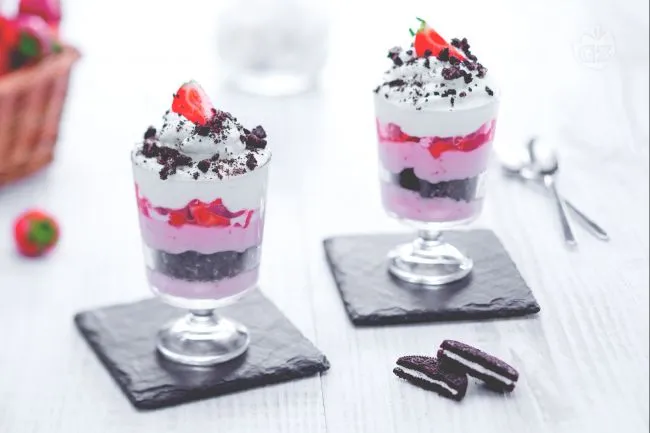 La magia nasce dall'incontro tra la crema di fragole, vellutata e avvolgente come una carezza, e l'interruzione audace dei biscotti Oreo che offrono un contrappunto scuro e friabile. Le fragole fresche, a pezzi generosi, irrompono con la loro acidità brillante, mentre la panna montata, appena velata di dolcezza, fa da soffice abbraccio finale a ogni strato.