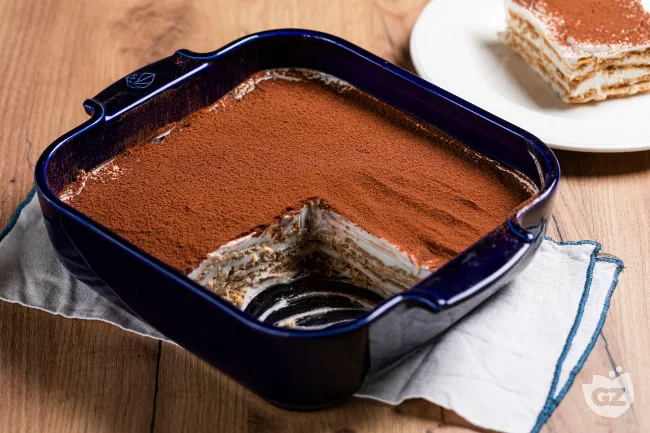 strato bianco e la morbidezza controllata dei biscotti imbevuti di caffè, il tutto coronato da una spolverata di cacao amaro che aggiunge un tocco di intensità e contrasto.