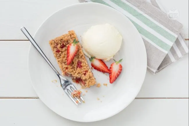 Lo streusel alle fragole è un dolce rustico e invitante, dove la friabilità della base e del topping si sposano con la morbida intensità di una composta di fragole fatta in casa. La doppia consistenza, tra croccante e cremosa, crea un contrasto piacevole che si scioglie in bocca, arricchito dalla nota agrumata della scorza di limone.