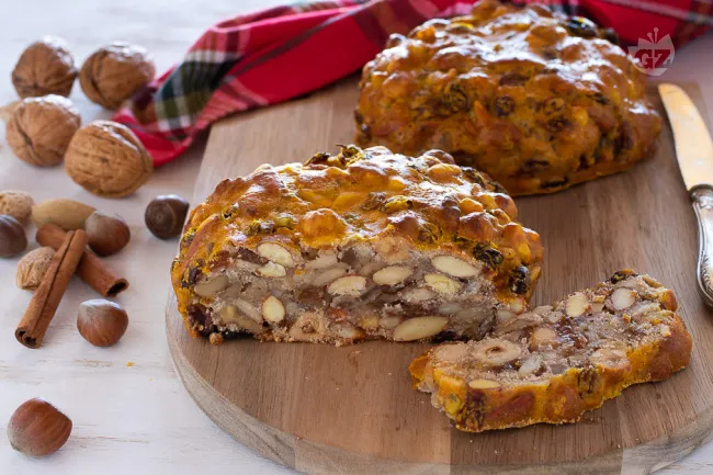 leggermente glassata racchiude un cuore ricco e compatto, dove la dolcezza della frutta candita si fonde con il tocco speziato della cannella e il carattere rustico della frutta secca tostata.