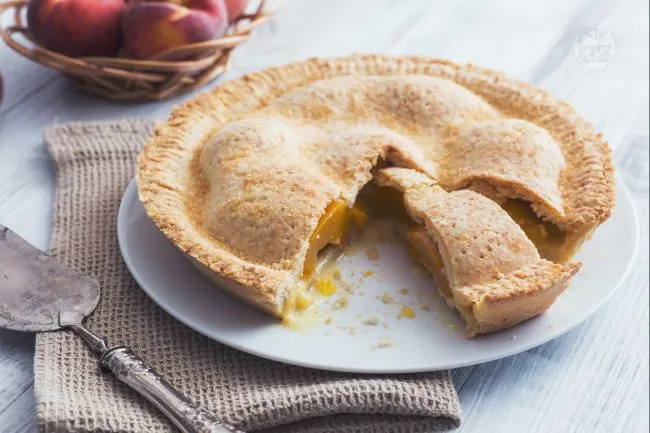La pie di pesche è un dolce estivo che unisce la rusticità di una crosta frolla fragrante alla delicatezza di un ripieno cremoso e fruttato. Ogni fetta offre un contrasto di consistenze: il guscio croccante si spezza per rivelare una crema pasticcera vellutata che avvolge le pesche morbide e succose, leggermente caramellate in superficie.