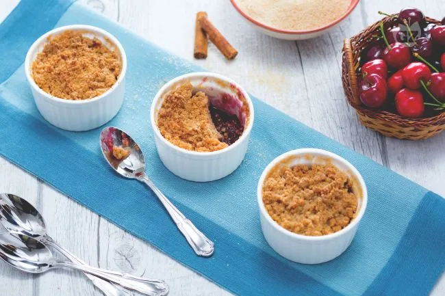 Il crumble di ciliegie è un dolce al cucchiaio che conquista per il contrasto tra la croccantezza dorata della briciolosa copertura e il ripieno di frutta succoso e leggermente acidulo. La cottura al forno esalta i profumi della vaniglia e della cannella, creando un dessert rustico ma raffinato, perfetto da servire ancora tiepido.