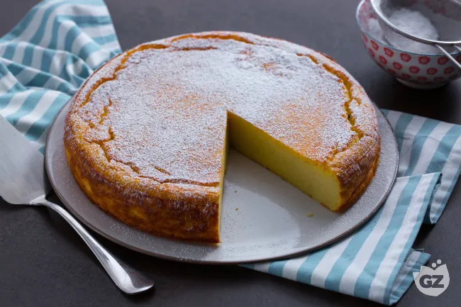 l'incanto di un dessert che è insieme rustico ed elegante: una crosta dorata che scricchiola appena sotto il coltello, per rivelare un cuore di seta compatto e morbidissimo.