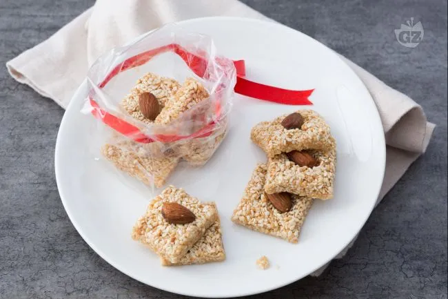 tostati si fonde con la morbida viscosità del miele, creando un contrasto di consistenze che si scioglie lentamente in bocca. Il profumo caldo e terroso del sesamo si sposa con le note floreali del miele millefiori, mentre la mandorla al centro aggiunge una piacevole sorpresa di sapore e una consistenza leggermente più tenera.