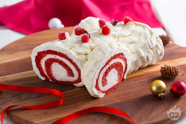 Il tronchetto red velvet è un dolce festivo che unisce l'eleganza visiva a un gusto ricco e sofisticato. La sua caratteristica principale è l'impasto morbidissimo e vellutato, di un rosso intenso, che si sposa con la crema al formaggio fresco e miele, creando un contrasto dolce e leggermente acidulo. La copertura al burro aromatizzata alla sambuca aggiunge una nota alcolica e speziata, mentre la decorazione finale con lamponi freschi e anice stellato regala freschezza e un tocco aromatico.