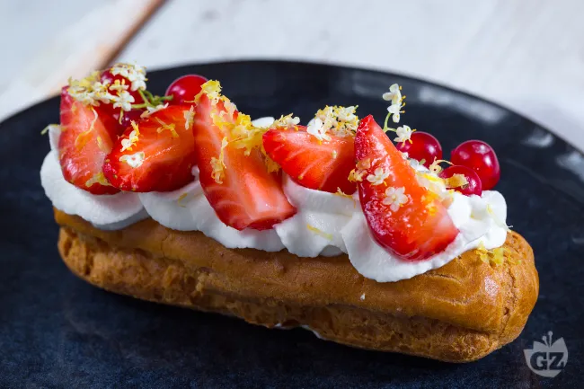 Gli éclair sono l'emblema della pasticceria francese, un'esperienza di consistenze che conquista al primo morso. La pasta choux, cotta fino a un dorato nocciola, racchiude una crema pasticcera alla vaniglia morbidissima, mentre la decorazione con panna montata e frutta fresca aggiunge un tocco di leggerezza e colore.