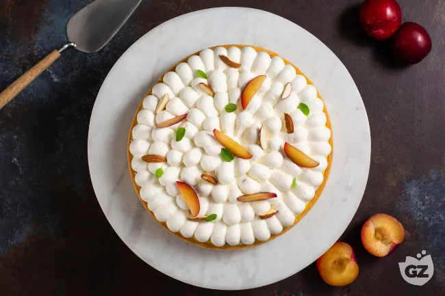 Questa crostata estiva è un trionfo di consistenze e sapori, dove la delicatezza della crema pasticcera alle mandorle incontra la freschezza acidula delle susine e la leggerezza di una chantilly profumata alla vaniglia. Un dessert che conquista per l'equilibrio tra la base frolla friabile, la farcitura cremosa e la nota fruttata che rinfresca il palato.
