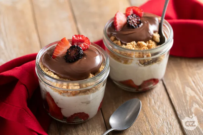 Un dessert monoporzione che unisce la cremosità del formaggio fresco alla golosità della Nutella, con il contrasto croccante dei biscotti e la freschezza della frutta di bosco. La preparazione senza cottura lo rende ideale per chi cerca un dolce veloce ma di grande effetto, perfetto per concludere una cena informale o per una merenda speciale. La morbidezza della crema al formaggio, aromatizzata con i semi di vaniglia, si sposa con l'intensità del cioccolato e della nocciola, mentre i biscotti sbriciolati offrono una piacevole nota croccante.