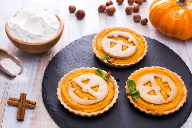 La combinazione di spezie – cannella in polvere e zenzero – esalta la naturalità della zucca senza coprirla, creando un equilibrio perfetto tra dolcezza e aromaticità. La doppia cottura della frolla garantisce una base croccante e uniforme, mentre il biscotto intagliato a forma di Jack O'Lantern aggiunge un tocco giocoso, rendendo queste tartellette ideali per una merenda d'autunno o come dolcetto di carattere per una festa di Halloween.