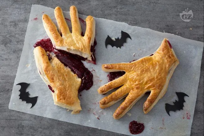 Una creazione dal fascino macabro e dal gusto sorprendentemente raffinato, perfetta per stupire gli ospiti durante le feste di Halloween. La sfoglia dorata e croccante racchiude un cuore di confettura ai lamponi dal sapore intenso e leggermente acidulo, che contrasta piacevolmente con la pasta burrosa. La forma della mano, con le unghie ben delineate e i taglietti sulle dita, rende questa preparazione un vero e proprio spettacolo visivo prima ancora di essere assaggiata.