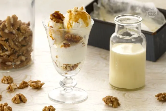 Un dessert che unisce la cremosità vellutata del gelato alla vaniglia al contrasto irresistibile delle noci ricoperte da una croccante glassa di caramello. La preparazione senza gelatiera rende questo dolce accessibile a tutti, offrendo un risultato di grande effetto, perfetto per concludere una cena o per una merenda speciale. Il segreto sta nell'equilibrio tra la delicatezza aromatica del baccello di vaniglia, che infonde note profonde e calde alla base, e l'intensità dello zucchero caramellato che avvolpe le noci, creando uno scricchiolio piacevole ad ogni boccone.