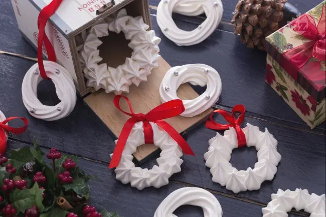 Le ghirlande di meringhe sono una creazione dolce che unisce la delicatezza di un dessert alla magia decorativa del Natale. Queste composizioni aeree, dalla consistenza croccante fuori e leggermente morbida dentro, si sciolgono in bocca rilasciando una dolcezza pura e non stucchevole, perfette per concludere un pasto festivo senza appesantire.