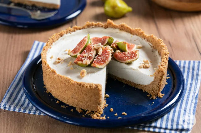 Una cheesecake fresca e raffinata che unisce la cremosità del formaggio vegetale alla dolcezza intensa dei fichi maturi, con una base croccante di biscotti e una nota finale di nocciole tostate. La consistenza è morbida e vellutata, grazie all'agar agar che garantisce una perfetta compattezza senza bisogno di cottura, mentre il contrasto tra la freschezza della frutta e la croccantezza della base crea un'esperienza sensoriale armoniosa.