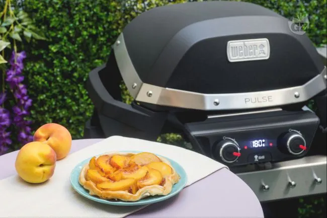 morbidissima e profumata. La cottura sulla griglia del barbecue dona un leggero sentore affumicato che esalta la dolcezza delle pesche e la croccantezza del caramello. La pasta brisè, preparata con burro freddo, garantisce una base sottile e sfogliata, mentre le pesche, cotte nello zucchero caramellato, si ammorbidiscono rilasciando i loro succhi, creando un cuore succoso e aromatico.