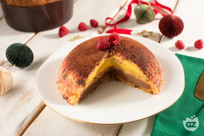 Lo zuccotto di panettone alle due creme è un dessert elegante che trasforma il classico dolce natalizio in una creazione stratificata di sapori e consistenze. La morbidezza del panettone, inzuppato con una confettura di lamponi, si alterna alla ricchezza di una doppia crema: una classica alla vaniglia e una intensa al cioccolato fondente, per un contrasto goloso che conquista il palato.
