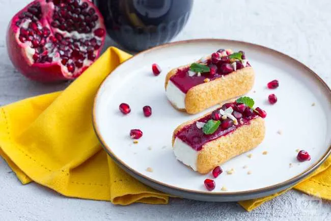 Un dessert elegante e raffinato che unisce la cremosità del semifreddo alla croccantezza dei Pavesini, con la nota agrodolce e vibrante della melagrana. La consistenza è morbida e vellutata, con piacevoli inserti di granella di nocciole e mandorle che regalano un contrasto croccante. La salsa di melagrana, cotta e filtrata, concentra il suo sapore intenso e fruttato, bilanciato dalla freschezza del succo di limone.