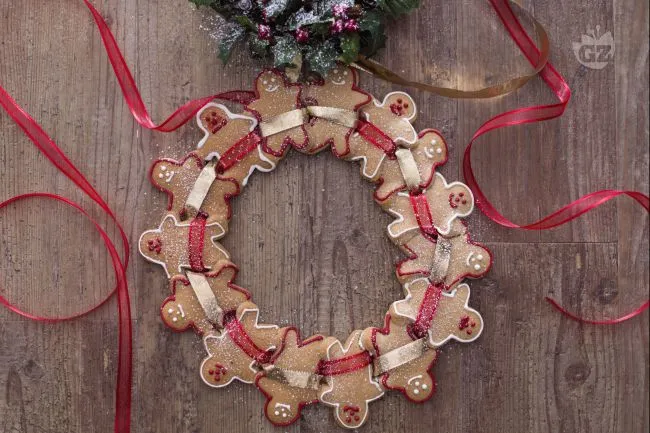 Ideale come centrotavola durante le cene di Natale o come regalo fatto in casa, questa corona è semplice da assemblare ma di grande effetto. La doppia glassa, bianca e rossa, permette di personalizzare la decorazione, mentre il nastro che lega i biscotti aggiunge un tocco festoso e pratico per appendere la ghirlanda.